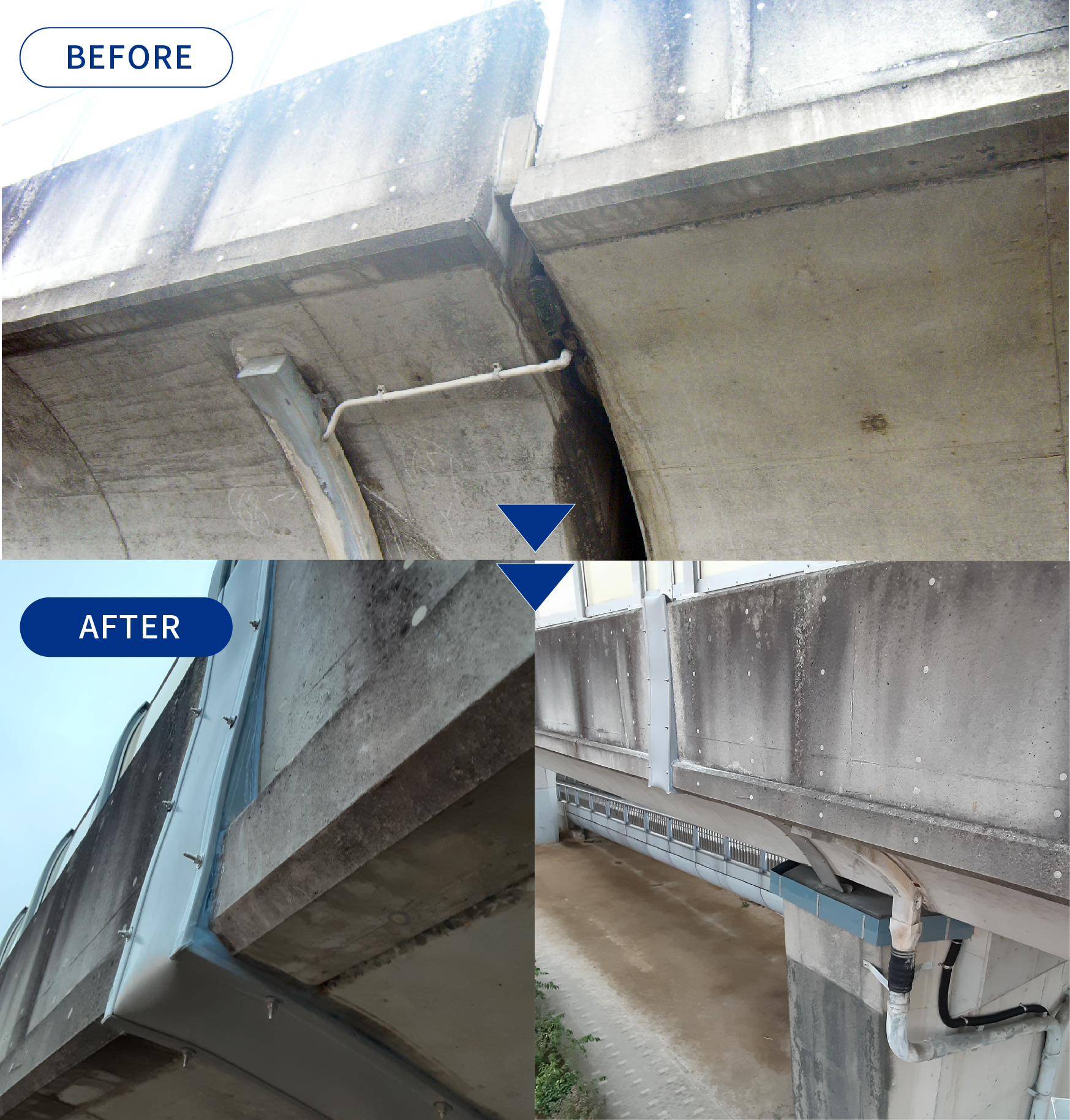 樋の設置により漏水が防がれ、通行車両や歩行者に滴下した漏水がかからなくなりました。