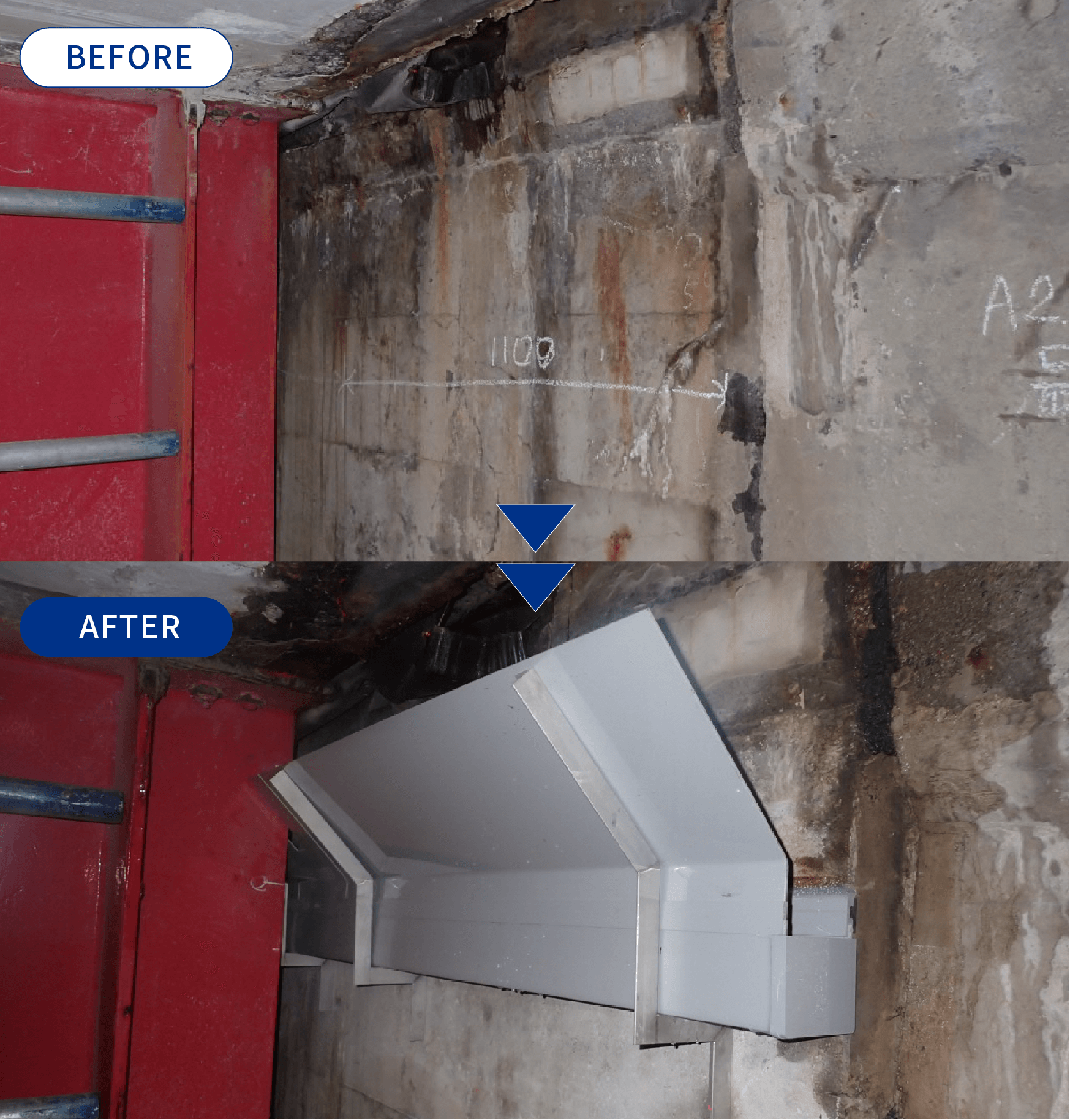 中分部に小片剥落対策としてアーチ・ドレンを施工し、アーチ・ドレンAD030耐寒透明(透明集水桝)および流末パイプを設置しました。これにより、剥落防止と漏水処理を同時に行う構造としました