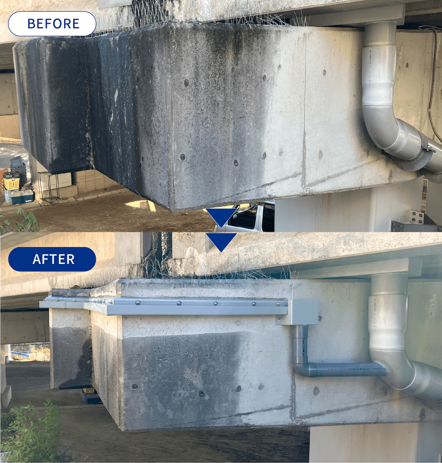 伸縮装置部からの漏水を適切に処理でき、支承部の劣化防止につながりました。