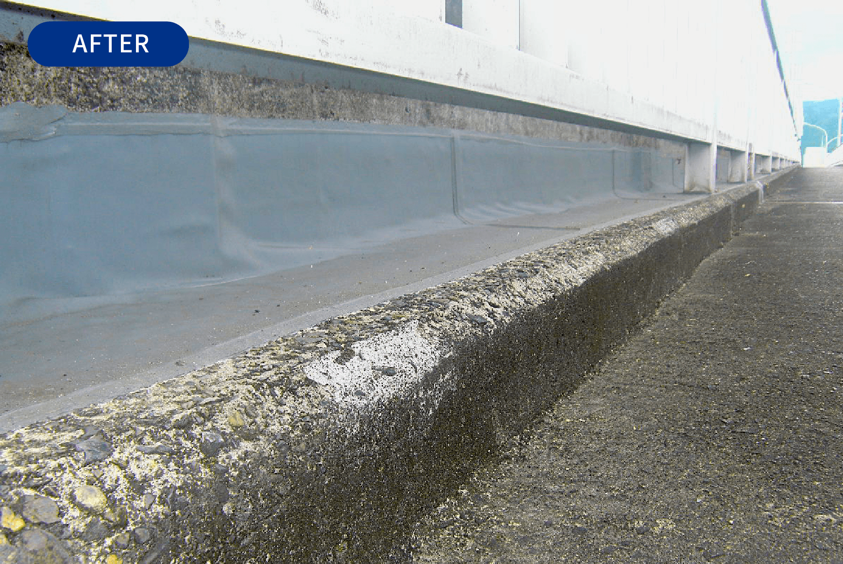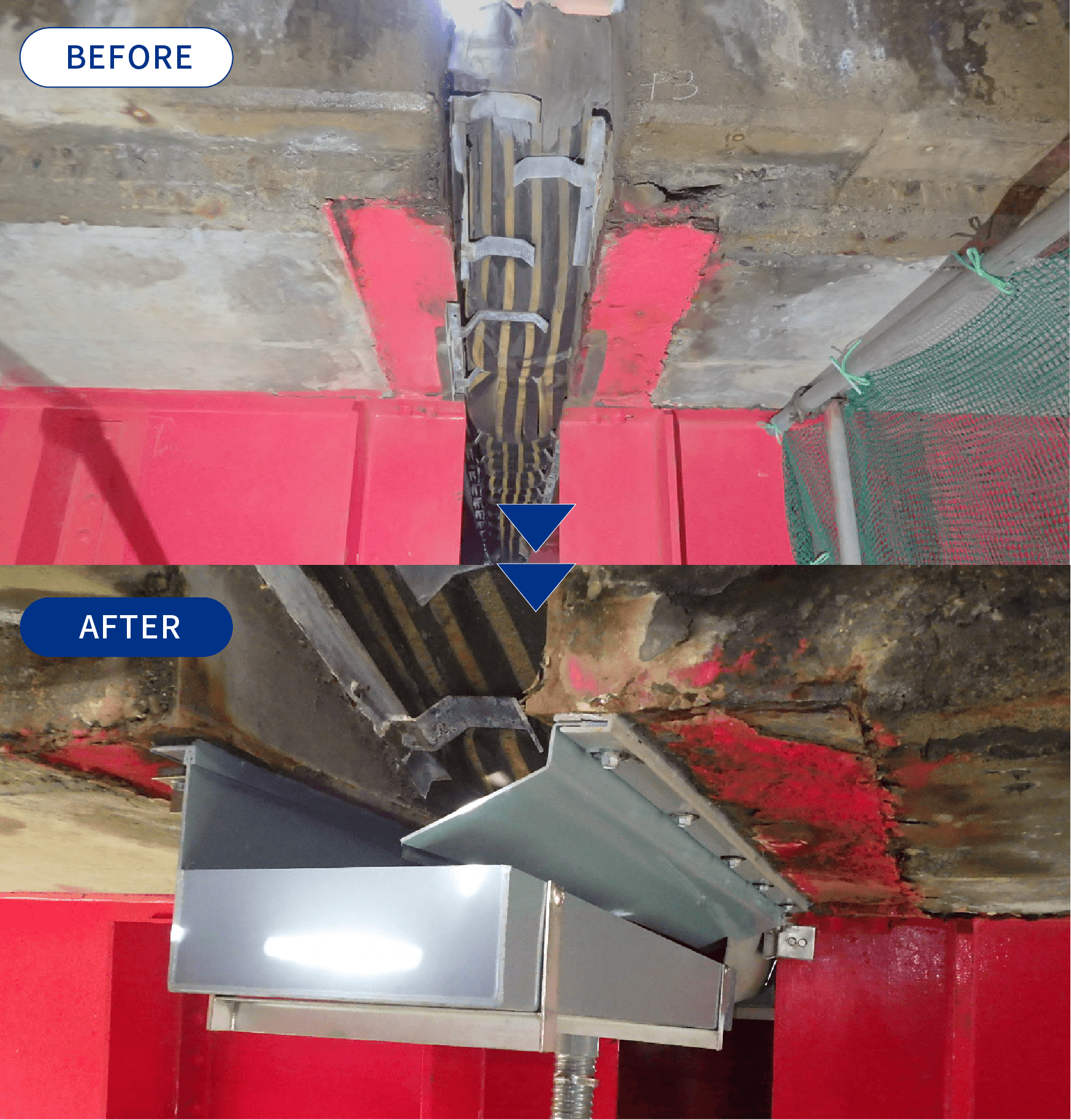 跨線橋と橋側歩道橋の間の遊間から雨水等が高架下へ落下し、通行者や周辺環境への影響が懸念されていました。