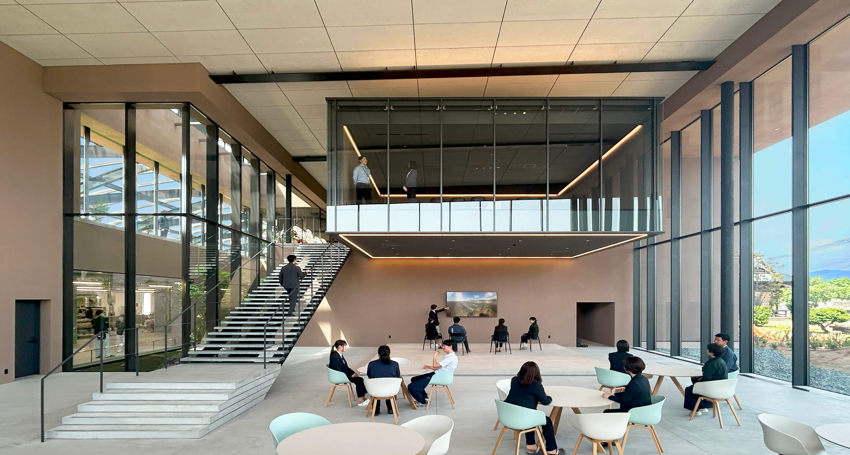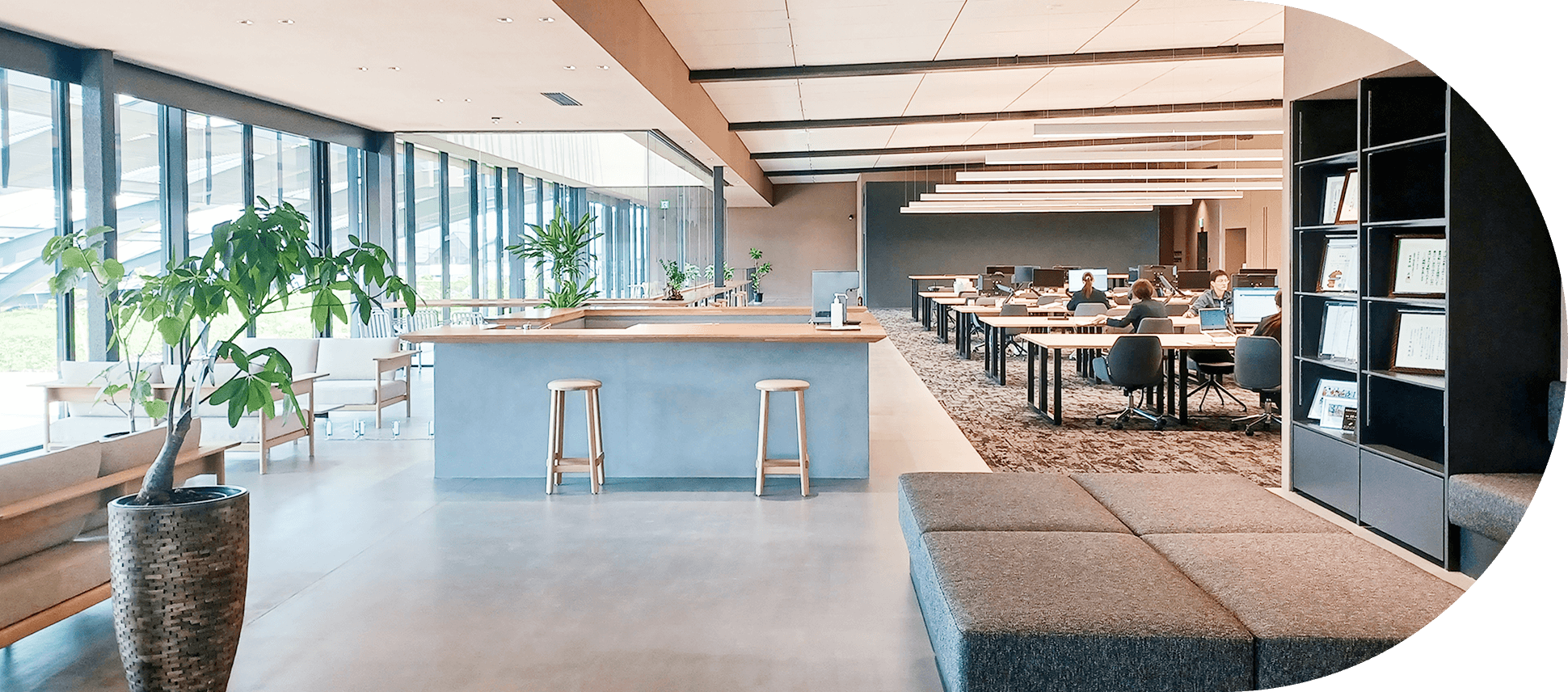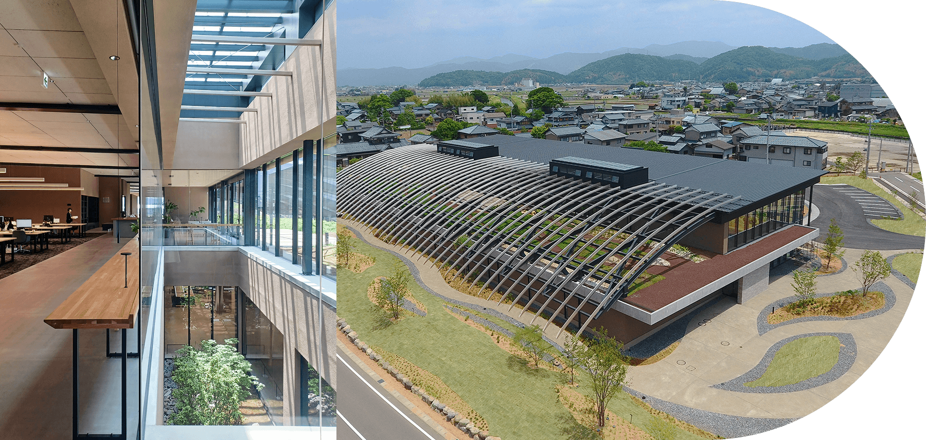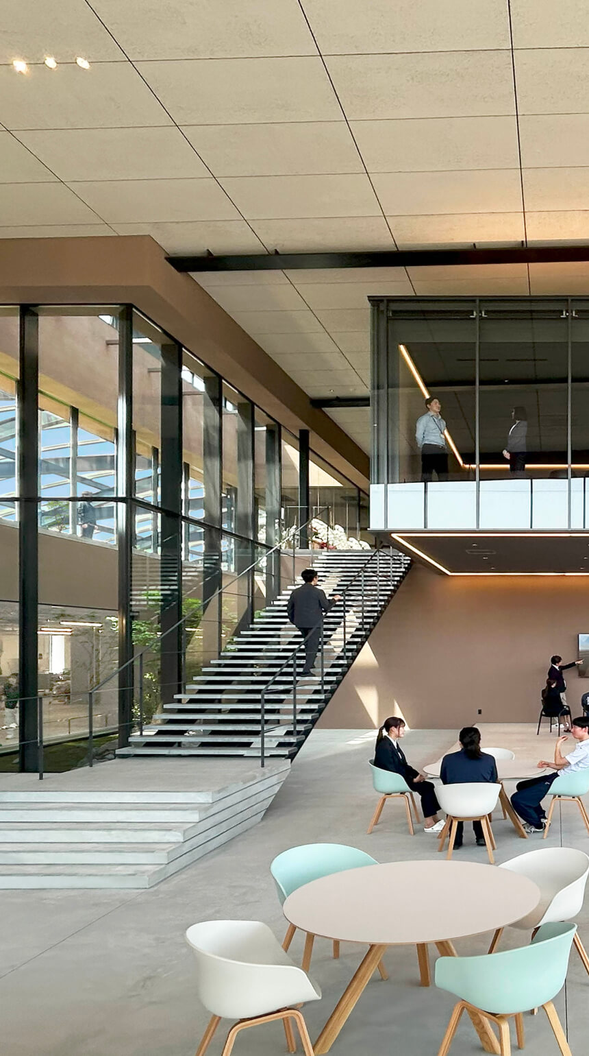 雨水をドレンで循環させて緑を育てていきます。この社屋そのものが、循環型、水の恵みを体現しています。冷暖房完備の工場が1階、2階がオフィススペースです。