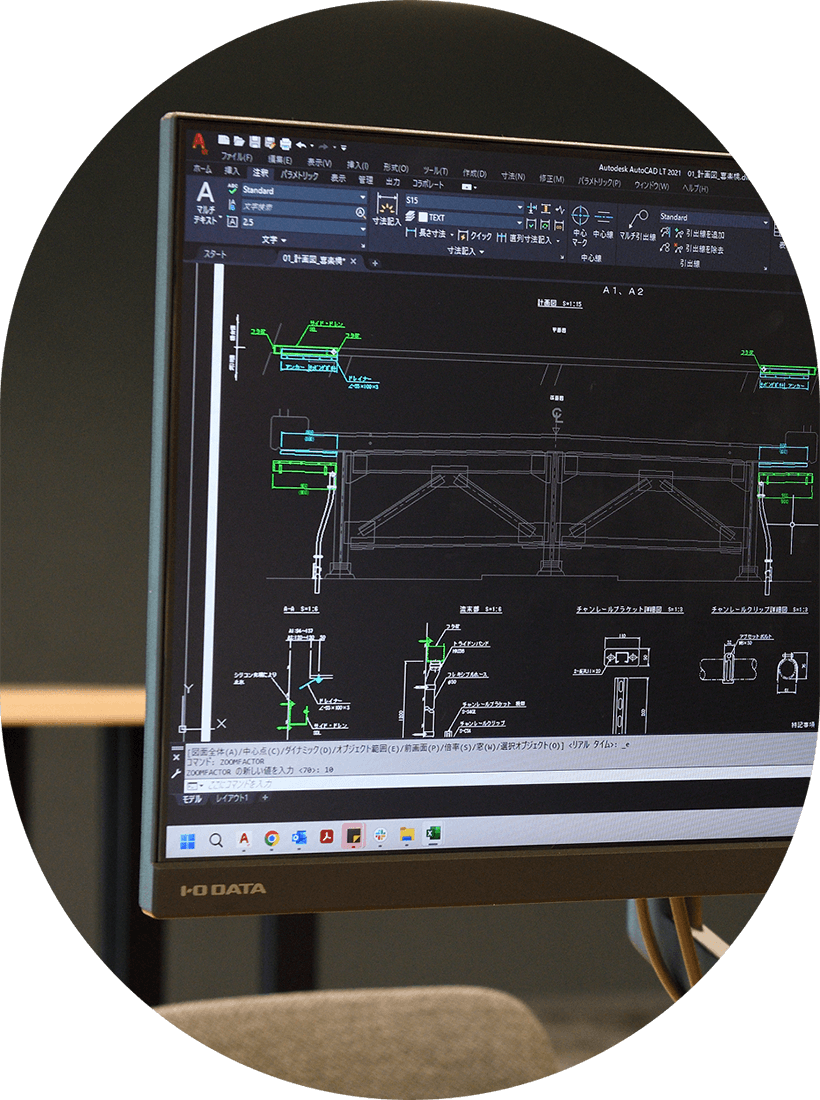 「どのような構造にするか」を検討し、CADソフトを使って詳細な設計を行います。安全性や強度、コスト、製作期間など多くの要素を考慮しながら最適解を導き出します。