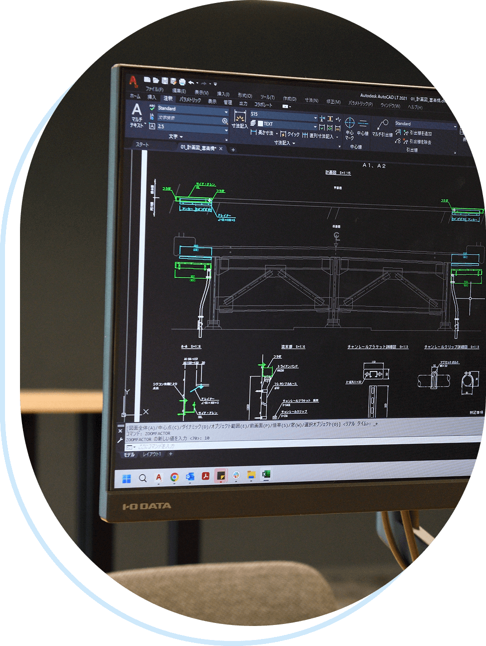 「どのような構造にするか」を検討し、CADソフトを使って詳細な設計を行います。安全性や強度、コスト、製作期間など多くの要素を考慮しながら最適解を導き出します。